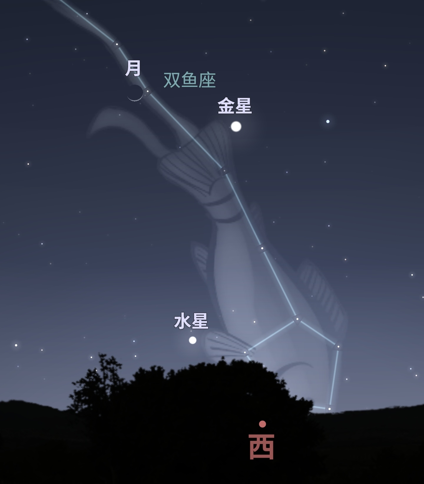 今天天气比昨日好多了,可以看到星星。今天晚上能看到一轮弯月,旁边的金星也分外亮眼。(下面的软件是Stellarium)