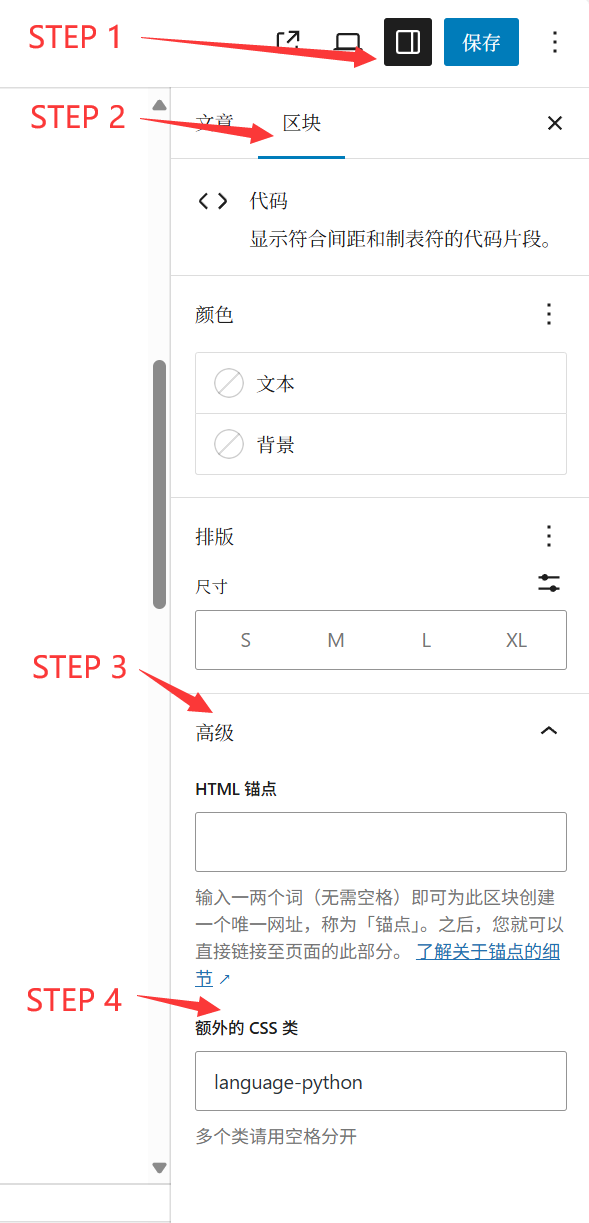 怎么办呢,最后找到了可视化编辑器的一个高级功能。点击右上角打开侧边栏,选择区块,找到“高级”一栏,可以在这里自定义css样式。没错!就是这里,在这里指定代码语言即可。