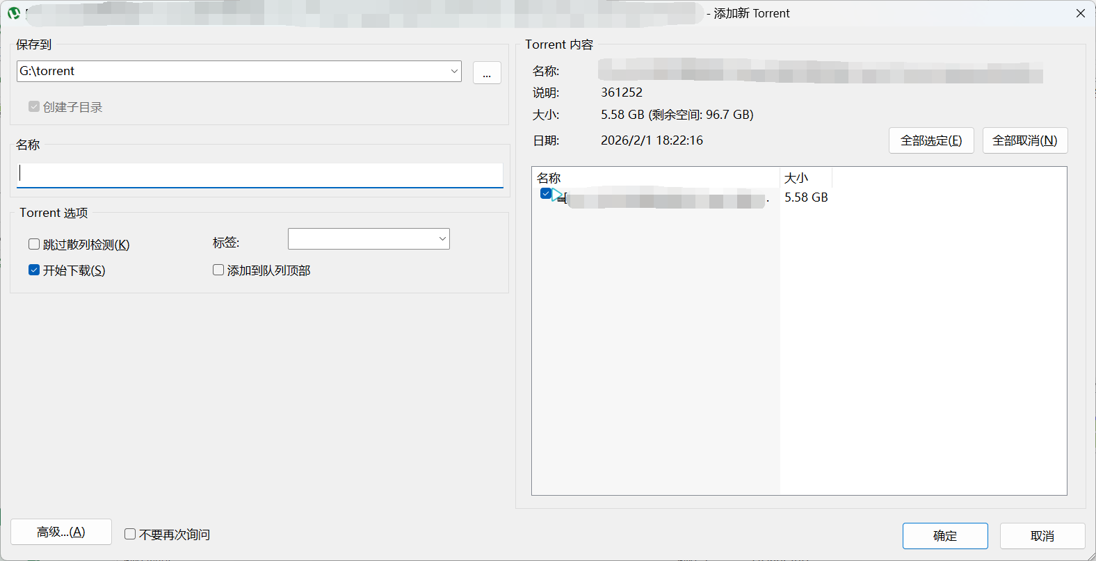 在你双击torrent文件或者将它添加到uTorrent客户端时,会弹出界面让你选择操作。这个时候,需要注意左侧的选项: